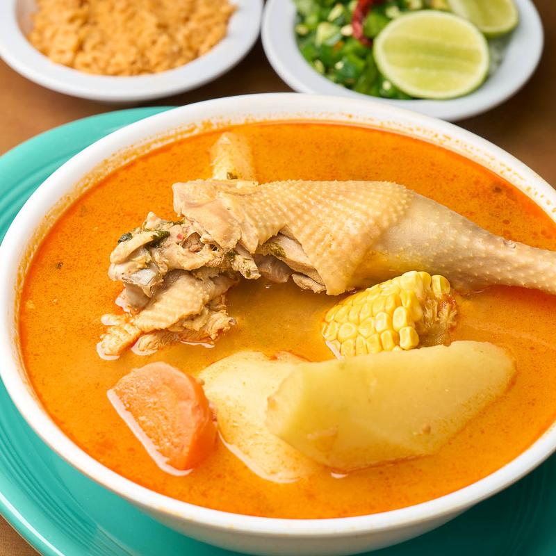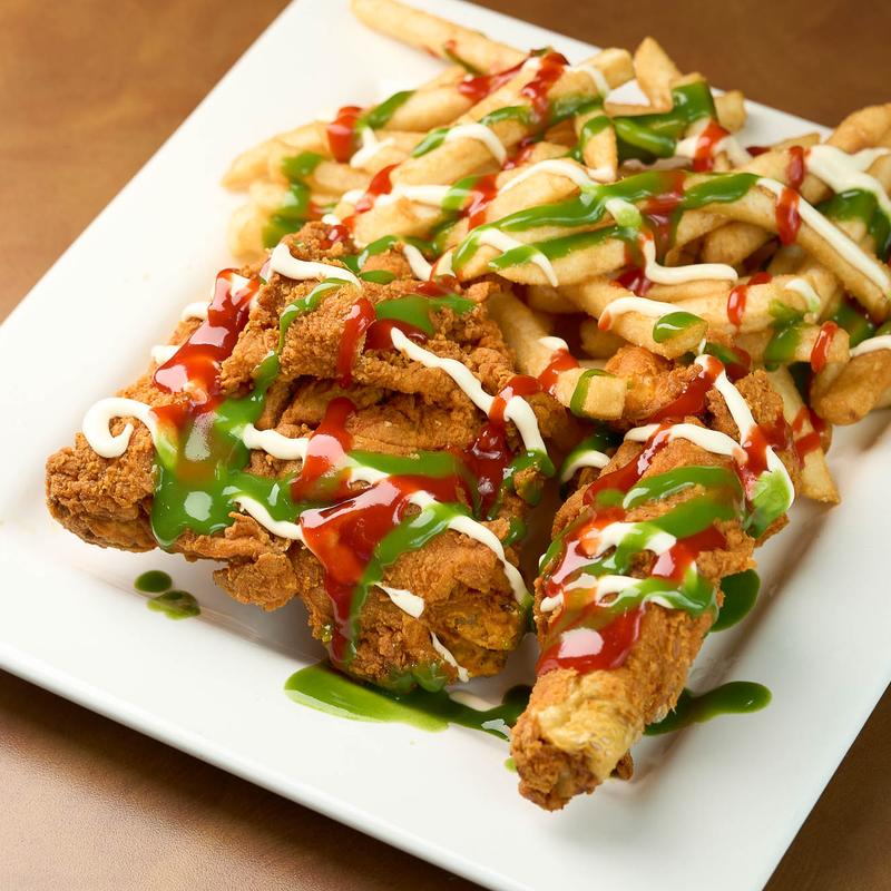 Fried chicken with french fries, topped with our Guatemalan staple green sauce, ketchup, and mayonnaise.