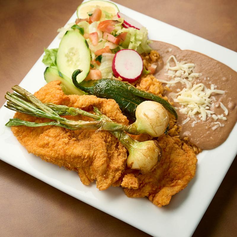 Grilled chicken cooked with onions and topped with our green chile sauce. Served with rice and beans.