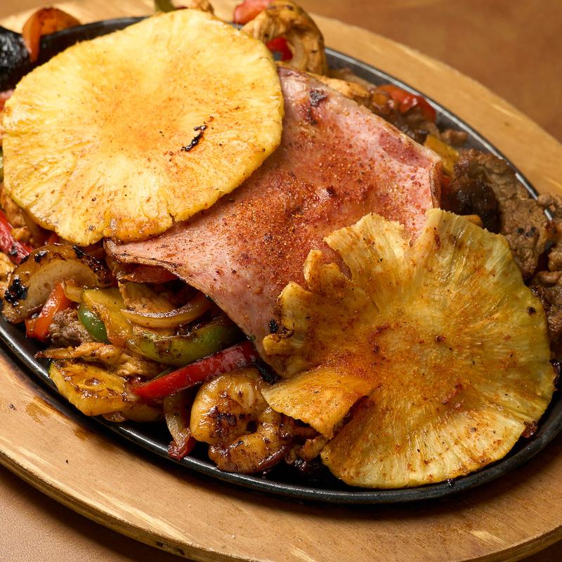 Combination of chicken, steak, sauteed vegetables, and shrimp. Topped with grilled pineapple.