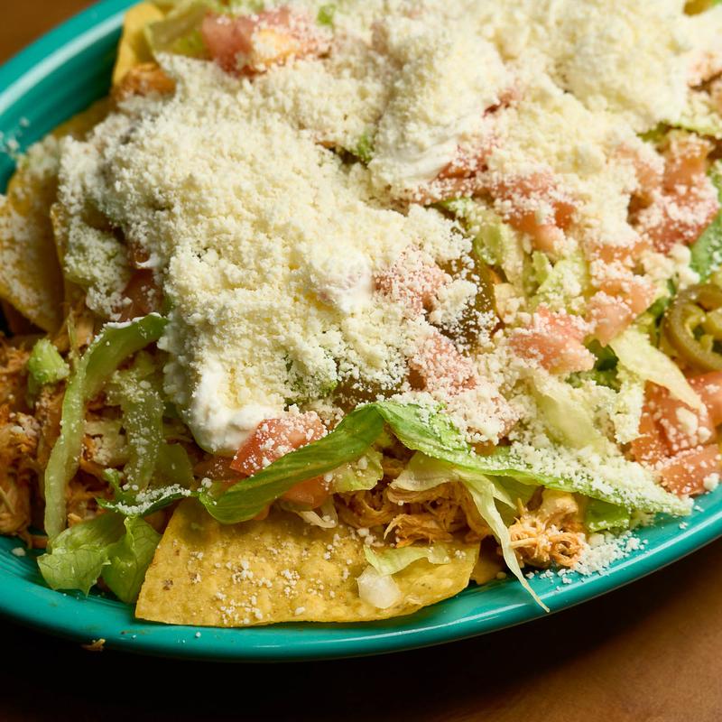 Deep-fried flour tortilla with your choice of steak or chicken, topped with cheese dip, lettuce, sour cream, and guacamole sour cream. Served with rice and beans.