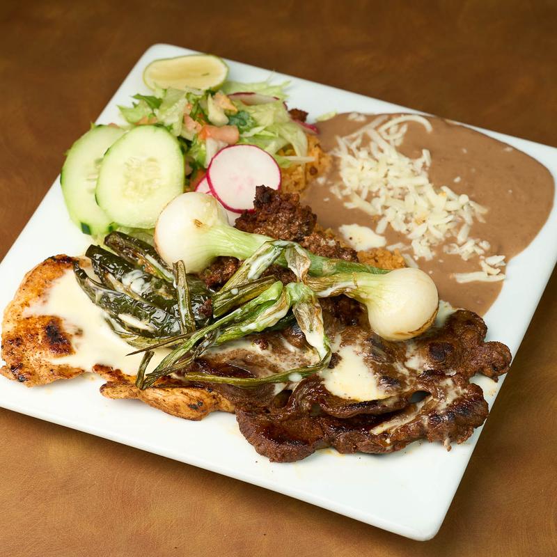 Steak, chicken, and chorizo (Mexican sausage), grilled onions, and cheese sauce. Served with rice, beans, and tortillas.
