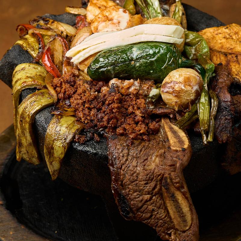 Grilled steak, chicken, shrimp, chorizo, cheese, onions, green onions, cactus, cilantro, tomatoes, and special sauce. Served with rice and beans.
